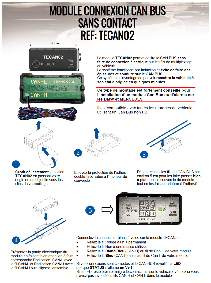 Le module TECAN02 permet de lire le CAN BUS sans faire de connexion électrique sur les fils de multiplexage du véhicule.